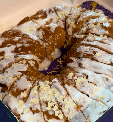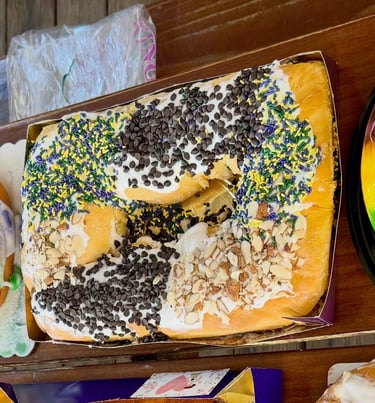This king cake is moist, lightly sweet, and milk-forward, inspired by the classic Tres Leches dessert. Expect a tender crumb and a delicate balance of sweetness that sets it apart from heavier, icing-dominant cakes.