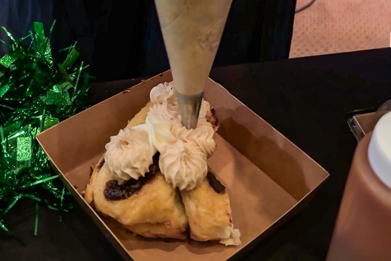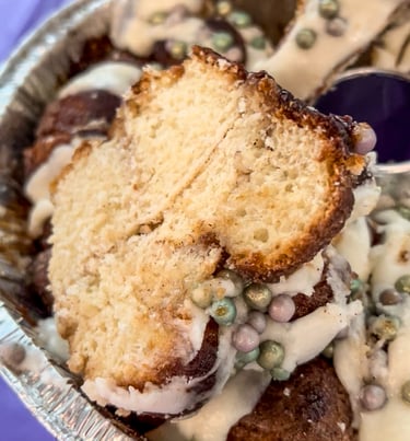 This king cake leans bold and modern. The Espresso Martini flavor combines coffee-forward richness with subtle sweetness, finished with a smooth, slightly boozy glaze that feels indulgent without being overpowering.
