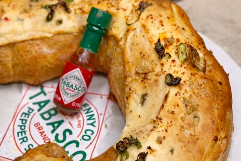 Savory king cakes have become a Carnival staple, and this one delivers. The Boudin king cake combines spiced pork, rice, and Cajun seasoning in a flaky, bread-based king cake format that’s perfect for Mardi Gras mornings.