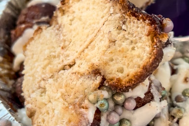 This king cake is all about pull-apart texture. Sticky, cinnamon-forward, and caramelized, it feels more like a shareable treat than a traditional slice, perfect for groups.